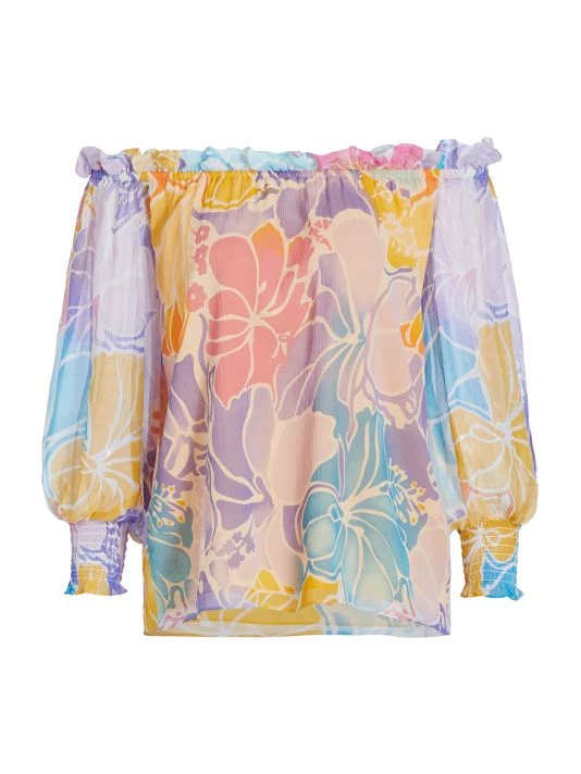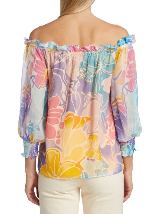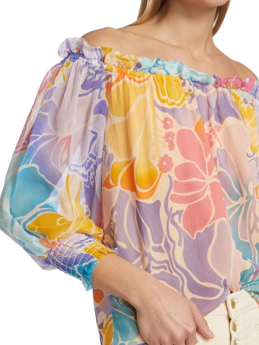 Crafted of pure silk, the Addison off-the-shoulder top from Ramy Brook features a bright hibiscus print. Blouson sleeves with smocked cuffs and ruffled trim finish this straight-fit style.