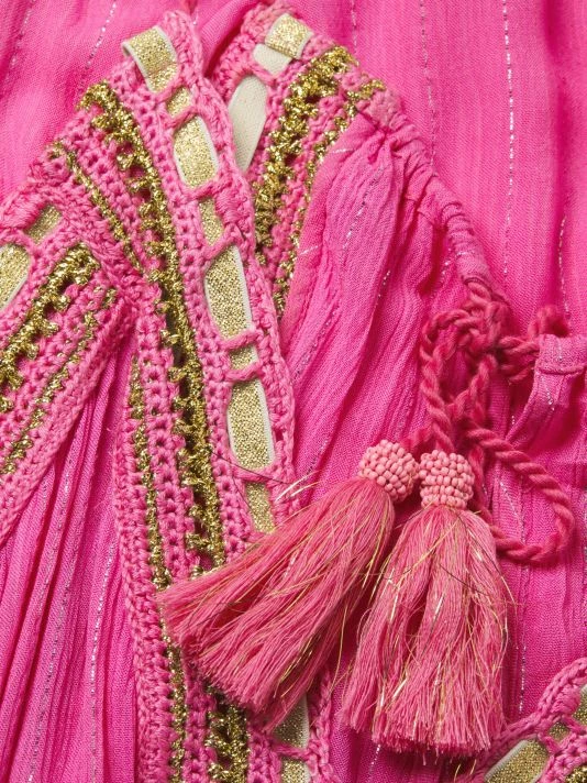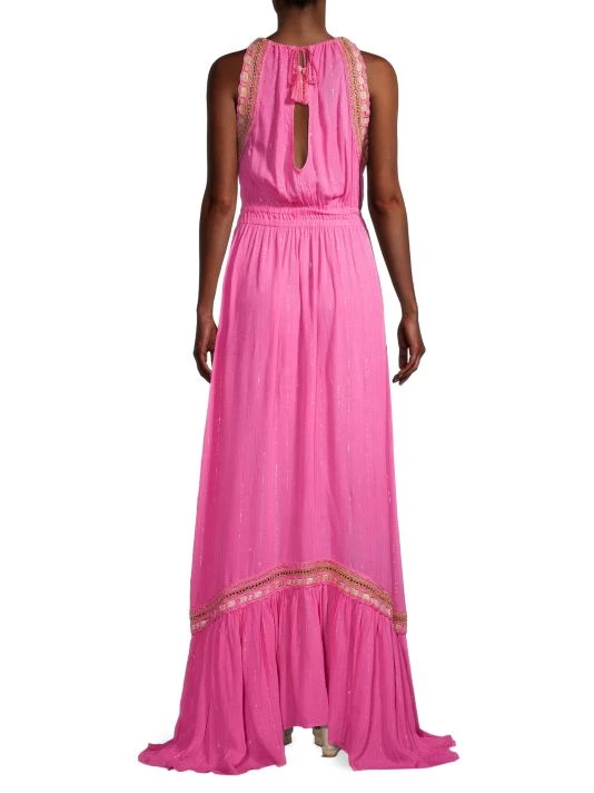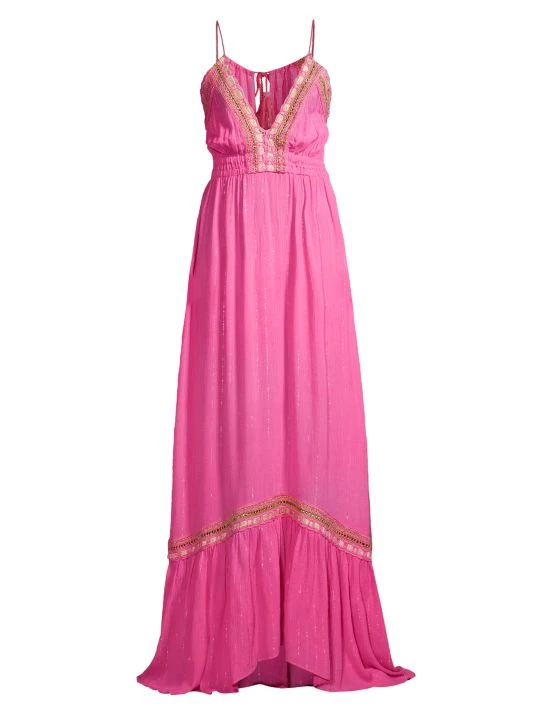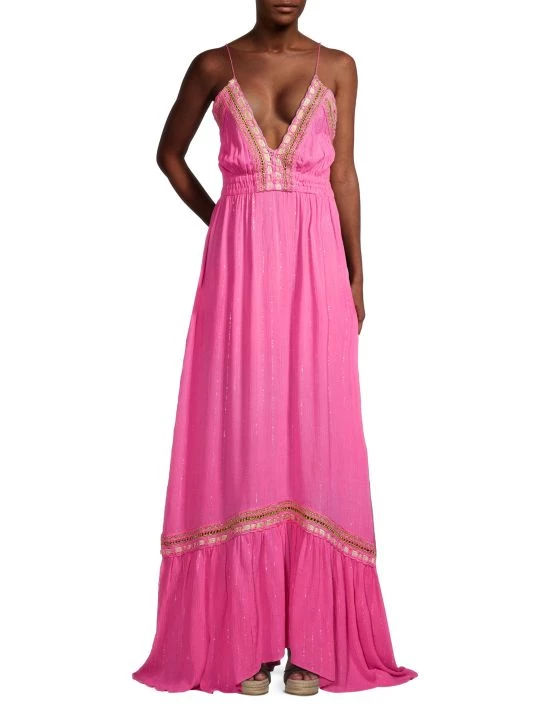 Designed with a tiered hem, Ramy Brook’s Amy dress flaunts a V-neck with intricate crochet trims. This floor-length piece is highlighted with metallic threading.