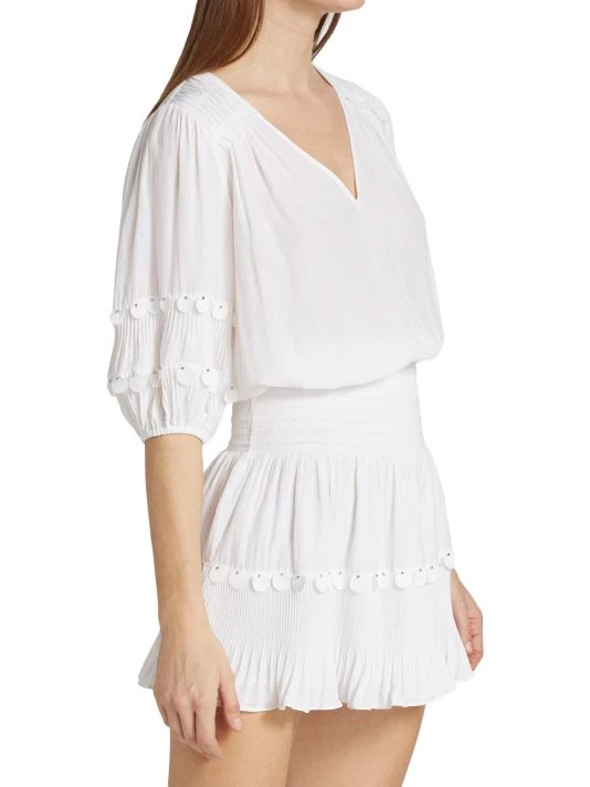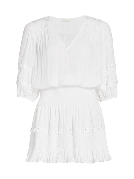 This boho-inspired Ramy Brook minidress features pleated details and the cuffs and hem complete with dot appliqués and silver beads.