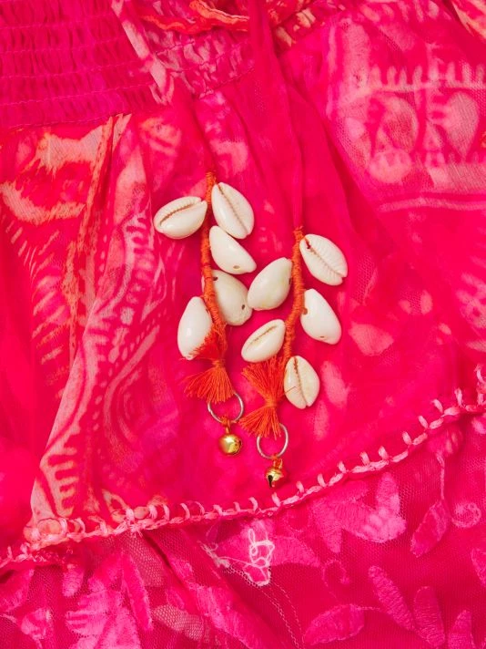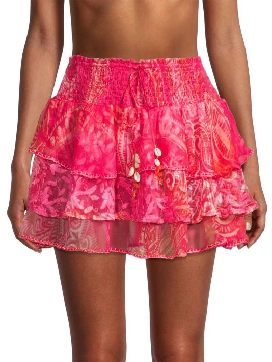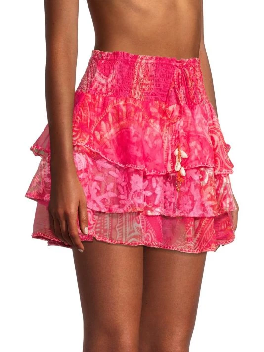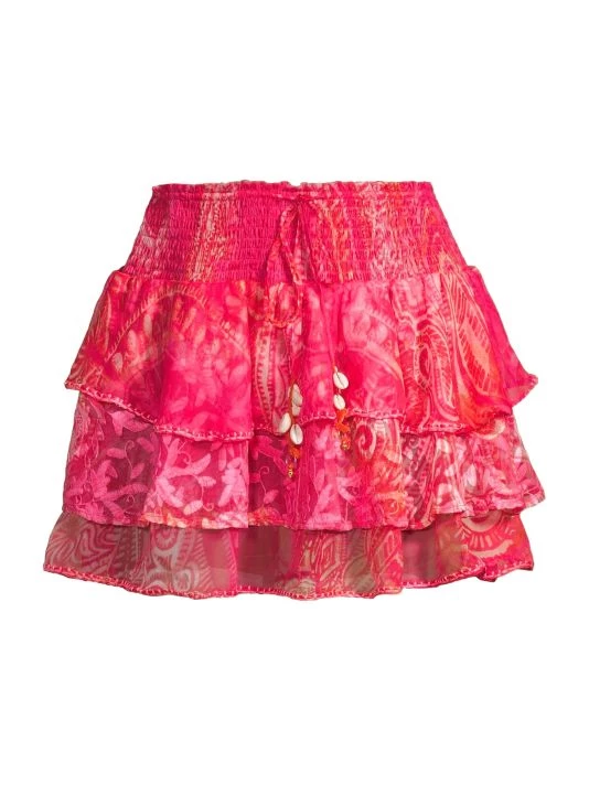 Chevron and paisley patterning lends style to this bohemian layered skirt, designed with a shell-embellished drawstring waist.