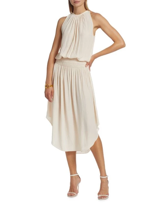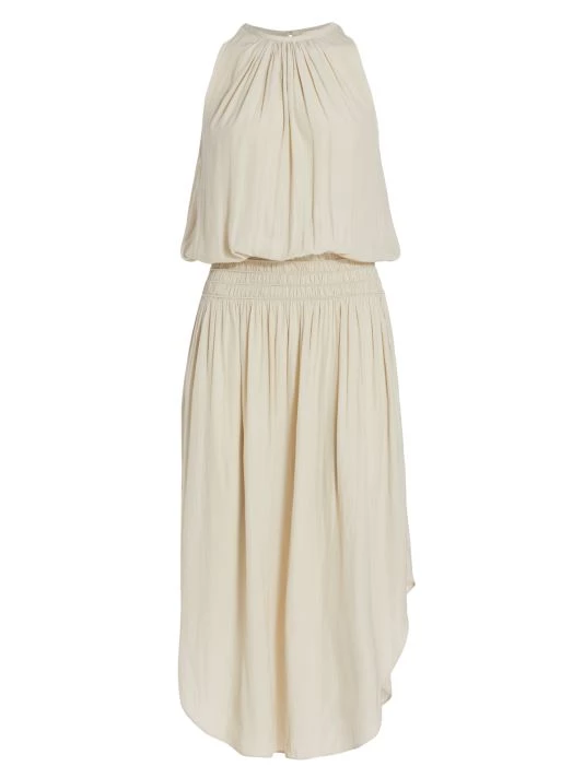 From Ramy Brook, the Audrey midi-dress features a rounded hem, a blouson-style bodice, and a wide smocked waistband. This fluid piece is styled with a keyhole detail at the neck, wearable in front or back.