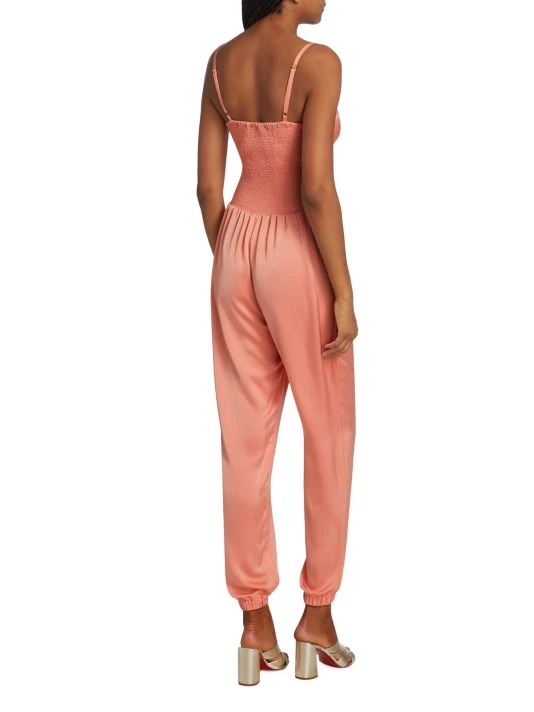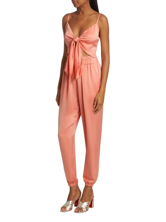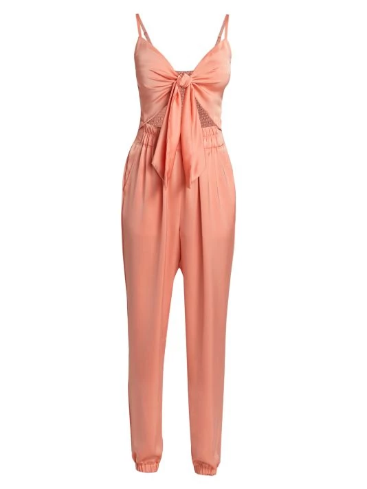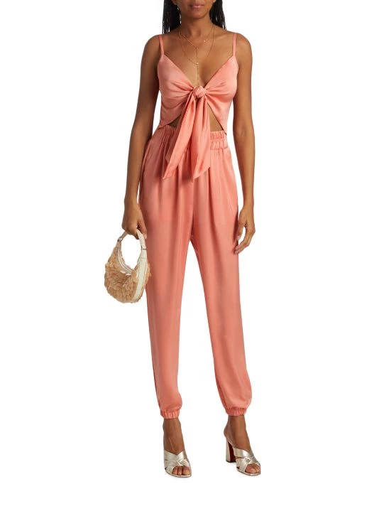 The Brit satin jumpsuit from Ramy Brook features a deep V-neck with a tie-front detail and a center cut out. An easy elasticized waistband and side slant pockets finish this effortless style.