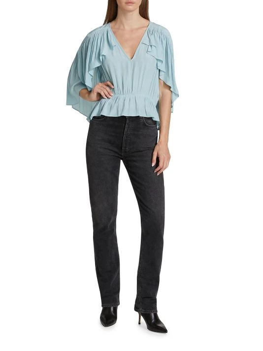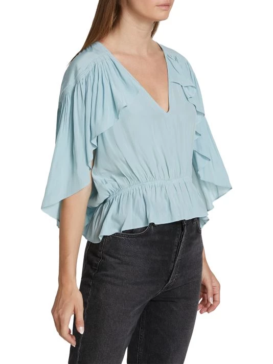 The Cambridge top from Ramy Brook features a V-neck blouson bodice with an elasticized waistband. Cascading butterfly sleeves define this elegant style.