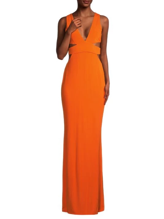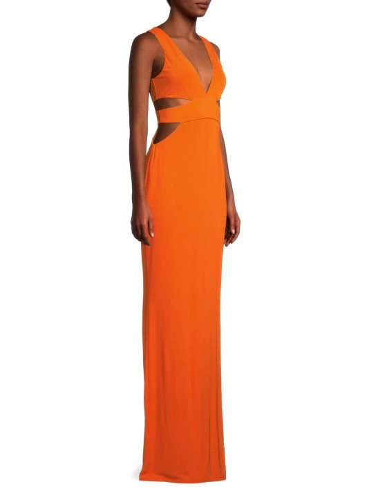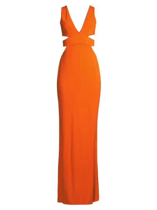 Ramy Brook’s Cara gown features sharp lines, adorned with a V-neck and side cutouts.