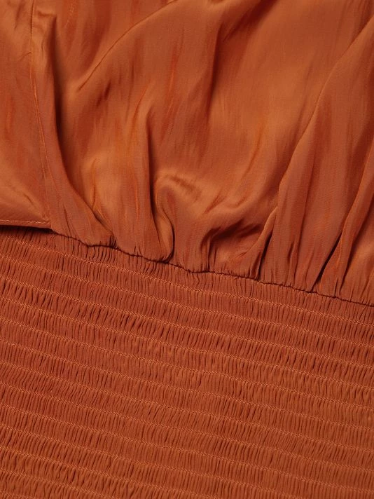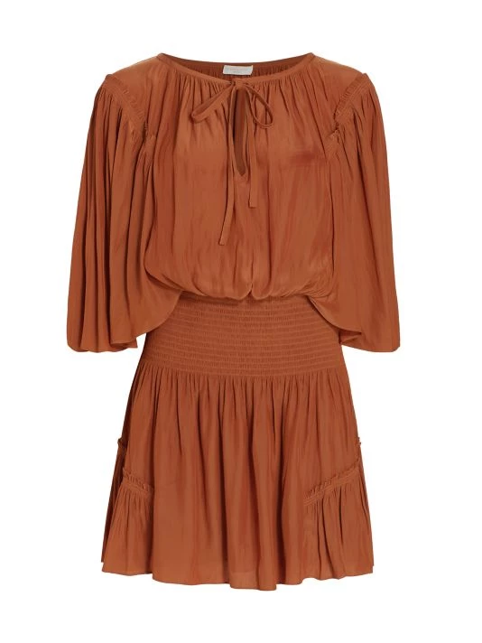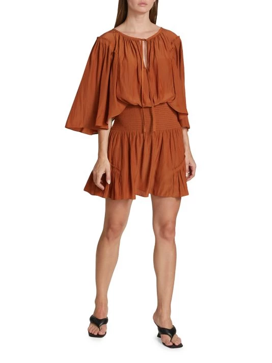 The Cece minidress from Ramy Brook features a split-neck blouson bodice with a wide, smocked waistband. Flowing butterfly sleeves complete the look.