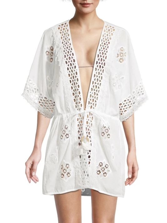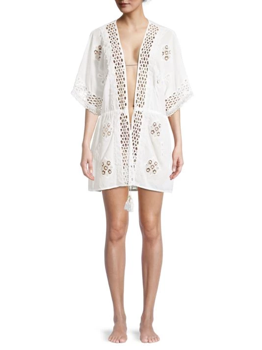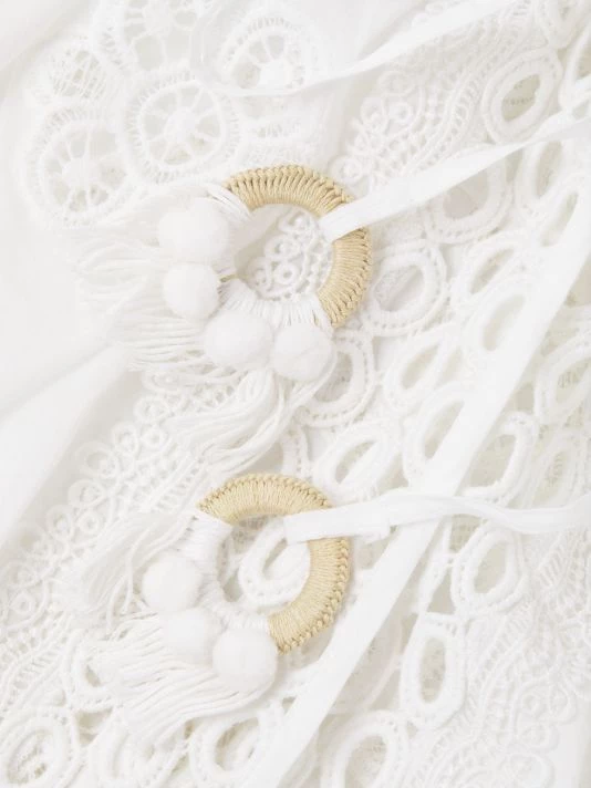 Lace coverup with a tassel tie and wide three-quarter sleeves.