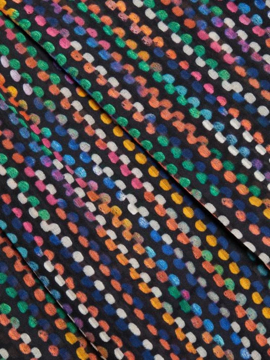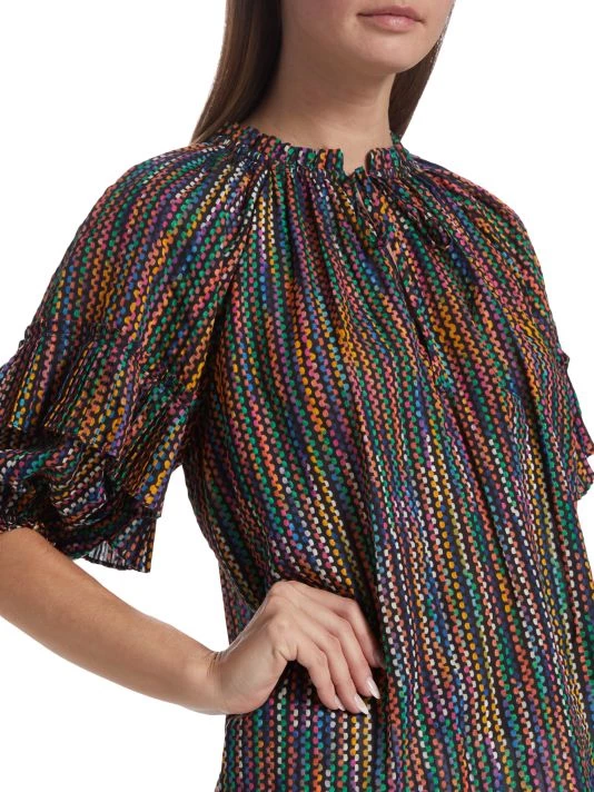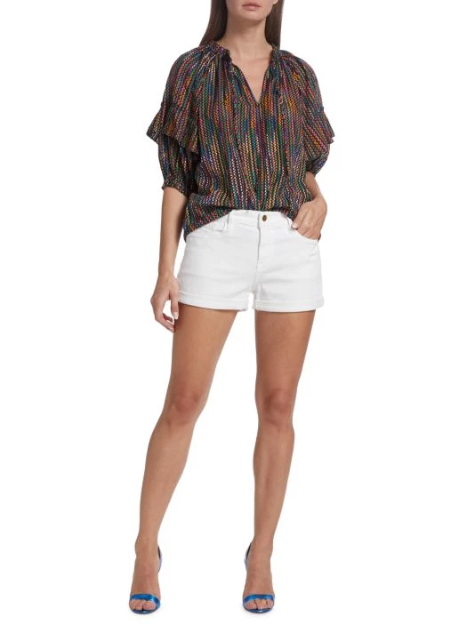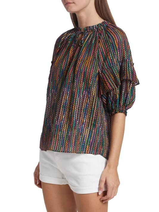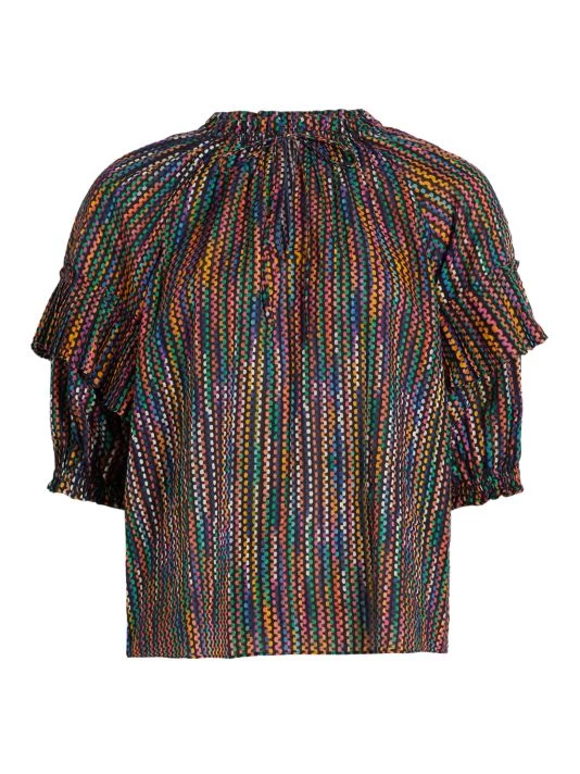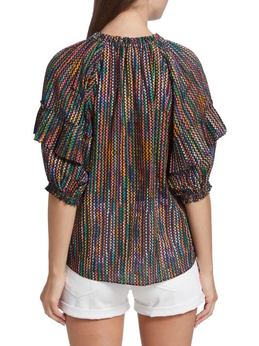 Ramy Brook’s Eugenia top is adorned with a multicolored pattern and ruffled sleeves.