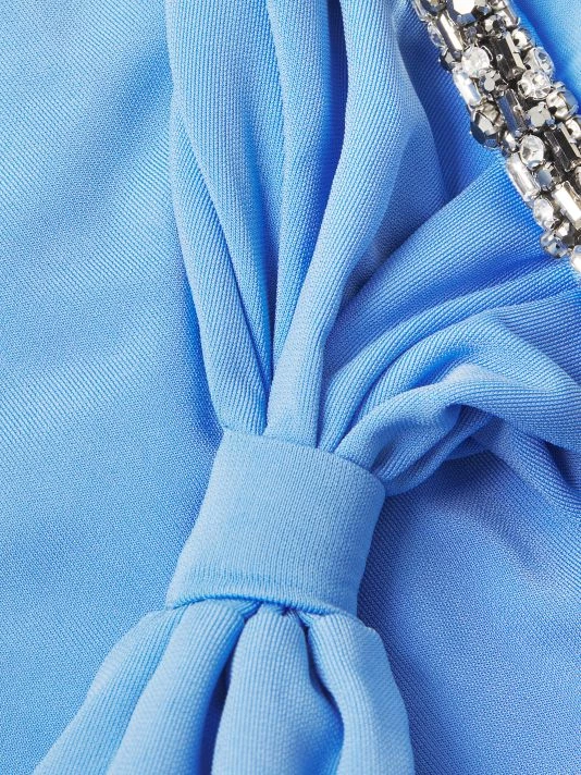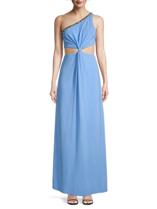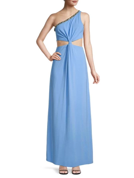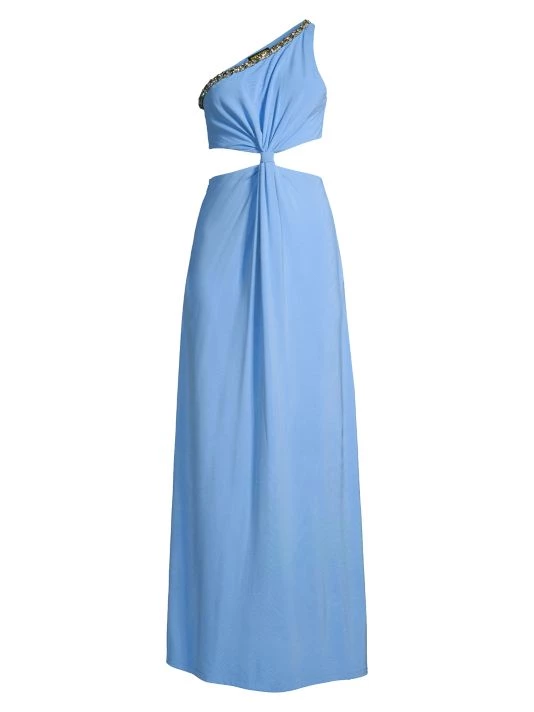Cut in a one-shoulder silhouette, Ramy Brook’s sleeveless Hailey gown is elevated by a bead-embellished neckline and wraparound side cut outs.