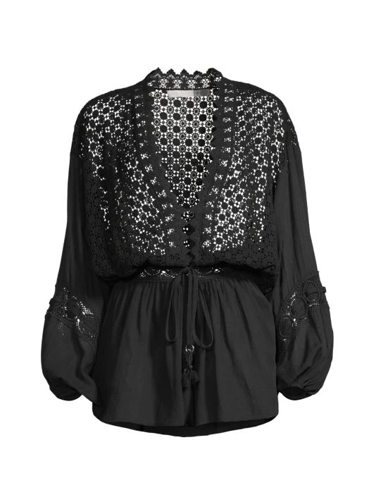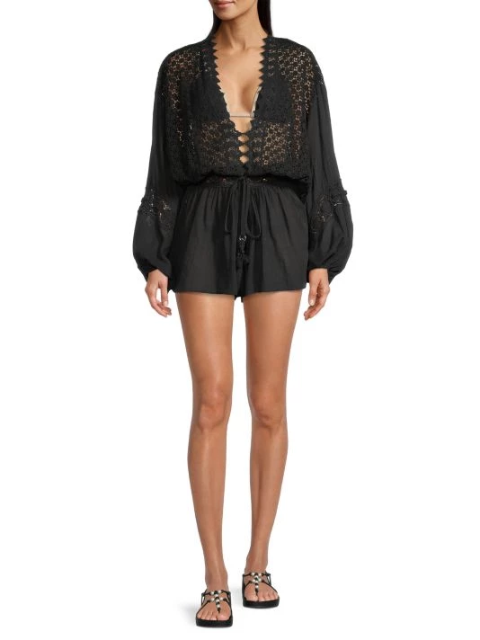 Flaunting a flattering plunge neck, Ramy Brook’s Hillary romper is crafted of soft cotton with intricate embroidery. This piece is finished with voluminous balloon sleeves.