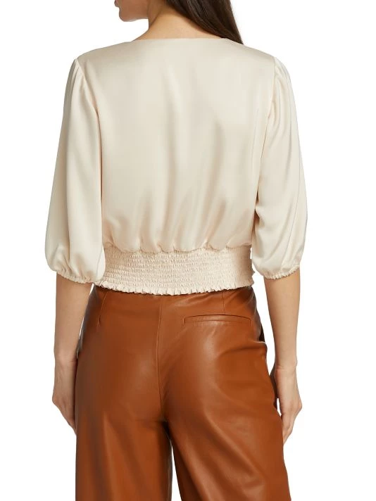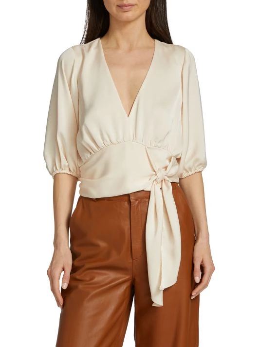 This elegant Iliana blouse from Ramy Brook pairs a sharp V-neck and empire waist, accented with a self-tie.