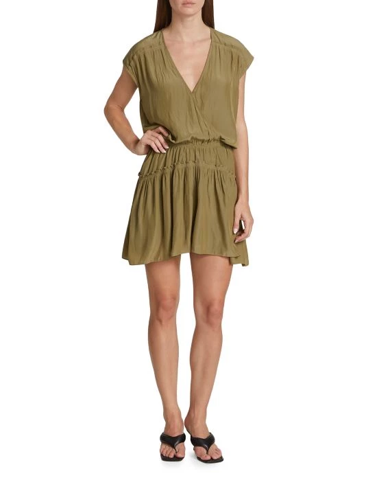 Ramy Brook’s Judy minidress features a short-sleeve V-neck bodice with an elasticized waistband. A tiered skirt finishes this relaxed-fit style.