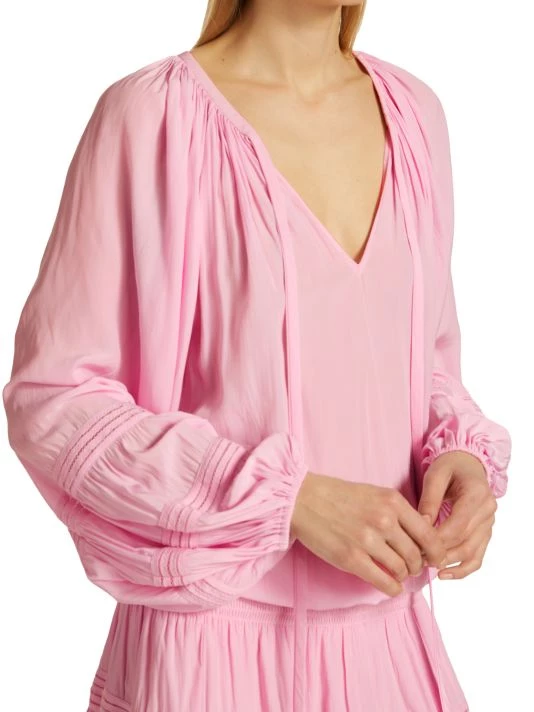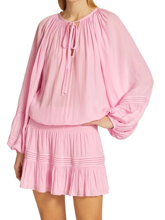 These charming minidress gathers at the self-tie neck framed by raglan sleeves, adorned with stitch details at the skirt.