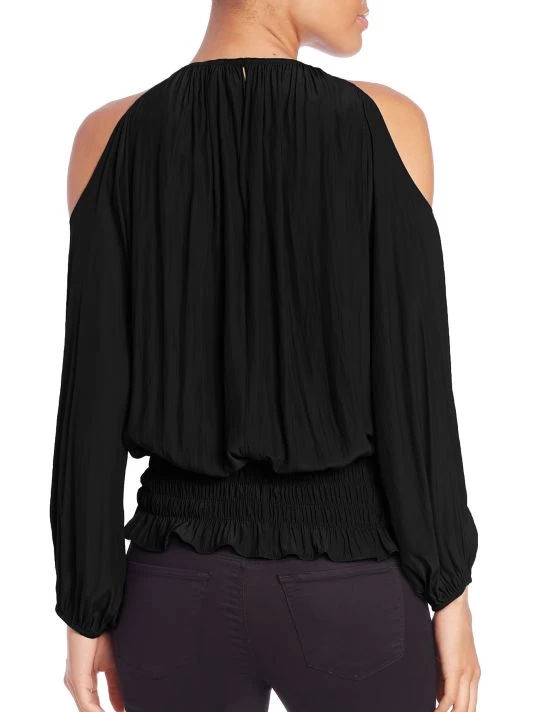 - Billowy shoulder-baring top with smocked hem