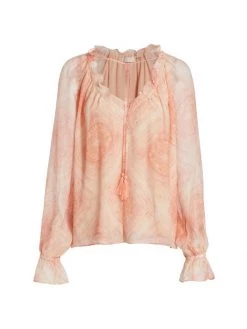 Crafted of decadent silk, the Lorraine blouse from Ramy Brook boasts an artful geometric print adorned with ruffles and a self-tie at the V-neck.
