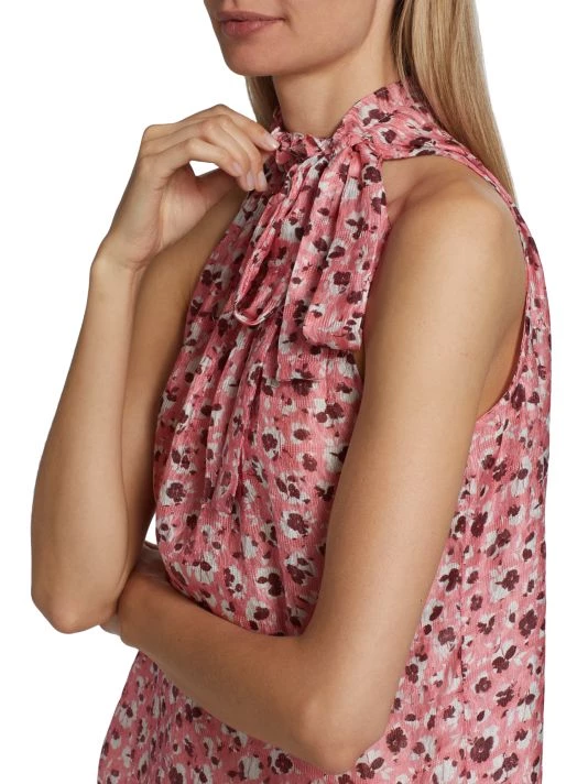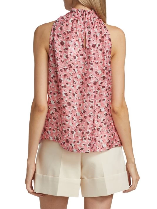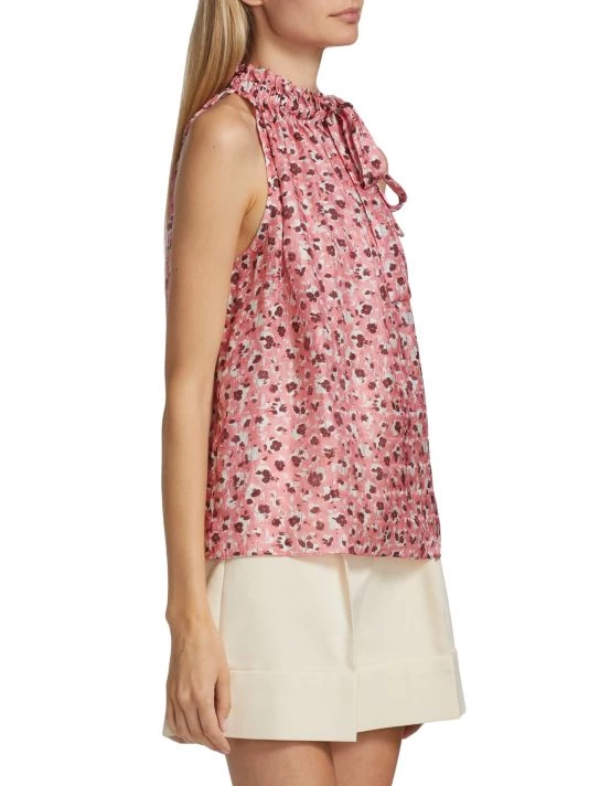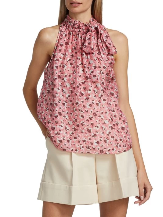 ONLY AT SAKS. Crafted of luxe silk, this pleated sleeveless top boasts a high self-tie ruffle neckline and mixed painterly prints.