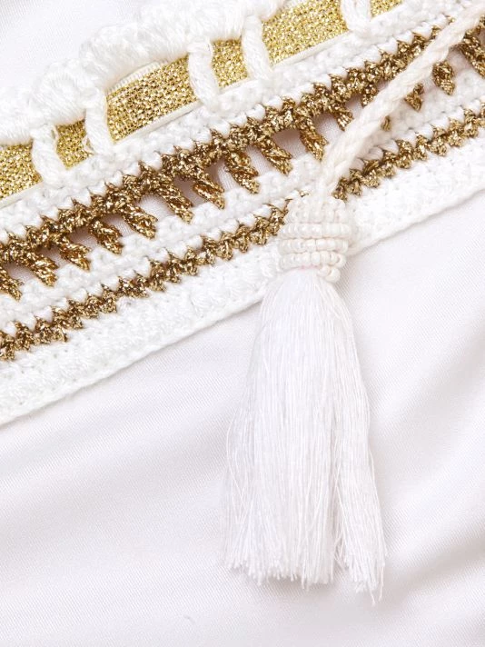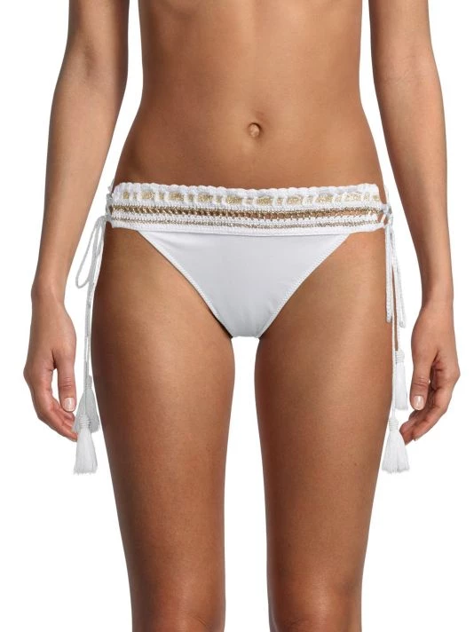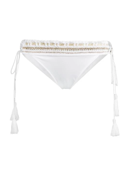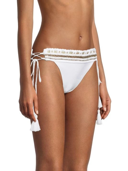 The Maya bikini bottom from Ramy Brook features a metallic crochet waistband. Lace-up side tie details with beaded tassels finish the look.