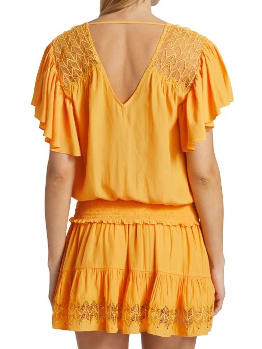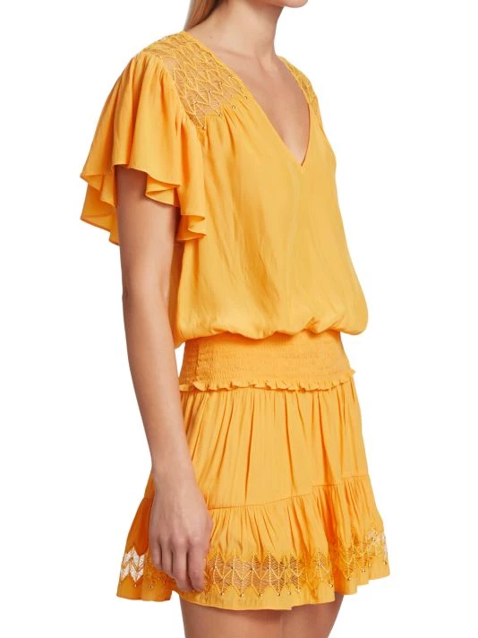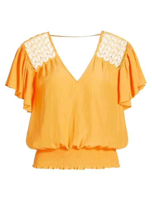 Ramy Brook’s Mia top features a blouson silhouette with a smocked waistband and short flutter sleeves. Crocheted panels at the shoulders and silvertone stud details add to this bohemian style.