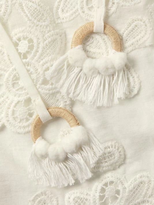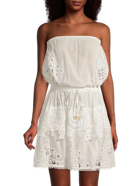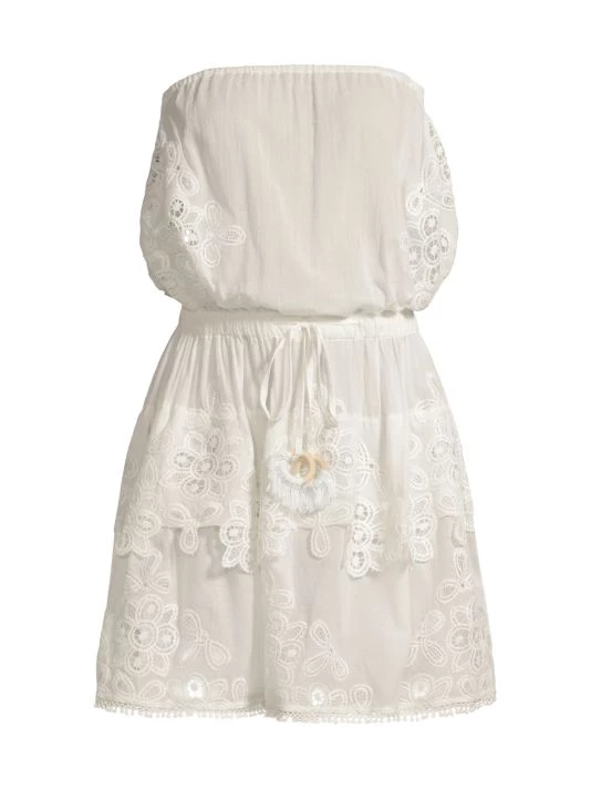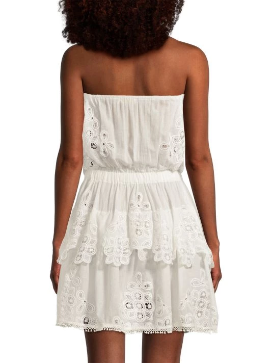 Cotton mini dress with strapless neckline, cinched waist, and a tiered skirt.