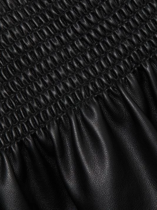 This Ramy Brook faux leather miniskirt features a smocked waistband and an edgy exposed front zipper.
