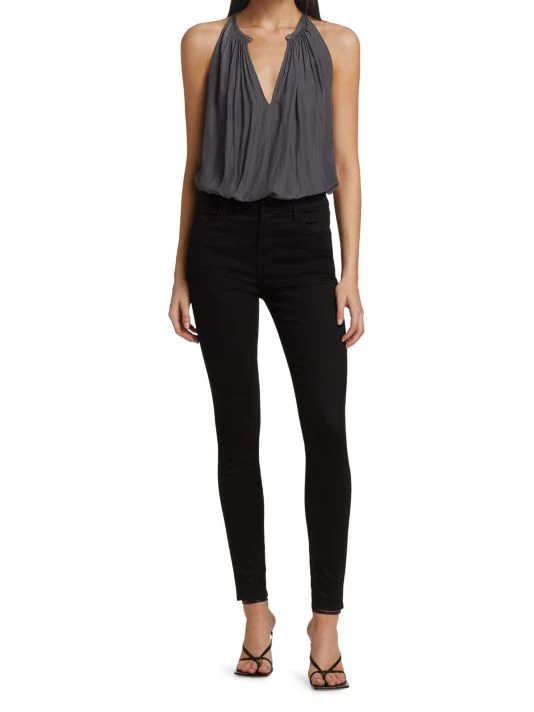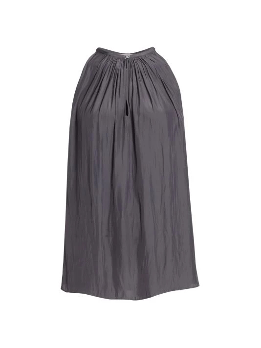 Striking staple detailed with pleated pattern and button closure to turn thisV-neck into a halter.