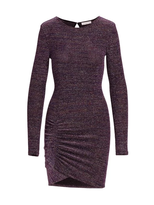 This fitted dress is made of metallic fabric with ruching at the waist.