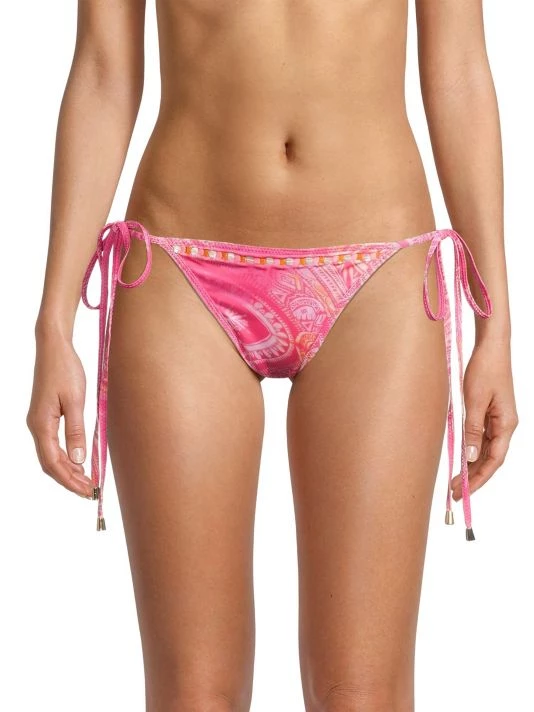 Ramy Brook’s low-rise bikini bottom is complete with an embroidered sequined front and a playful abstract print.