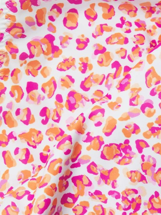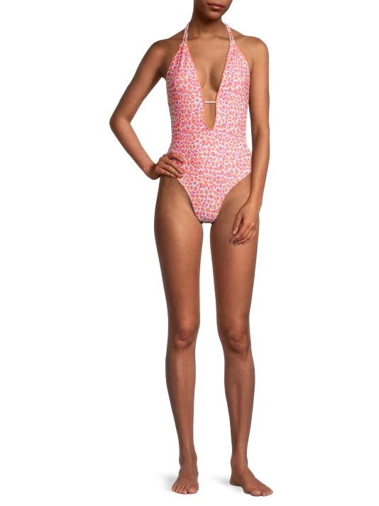 This bright one-piece swimsuit showcases an animal print, adorned with a tie-back design.