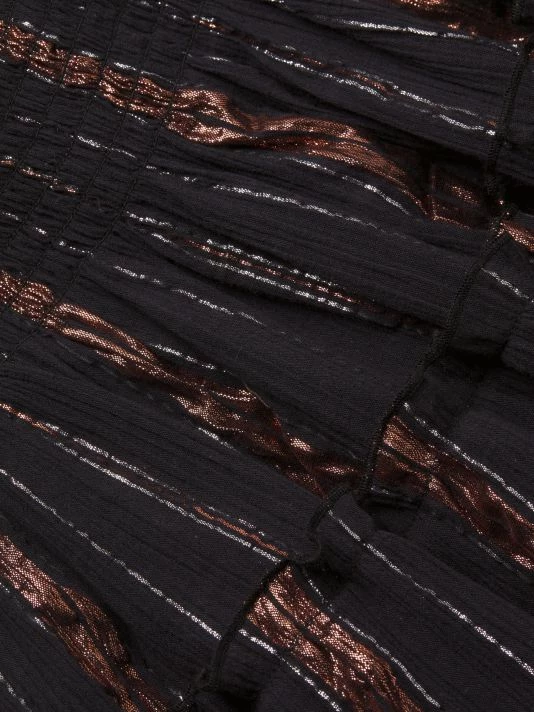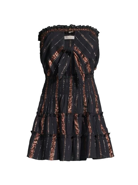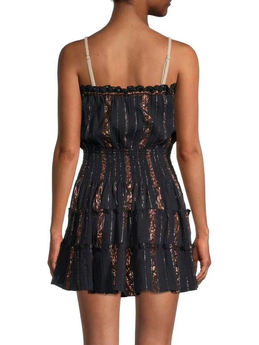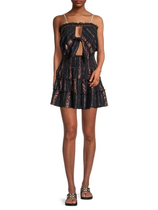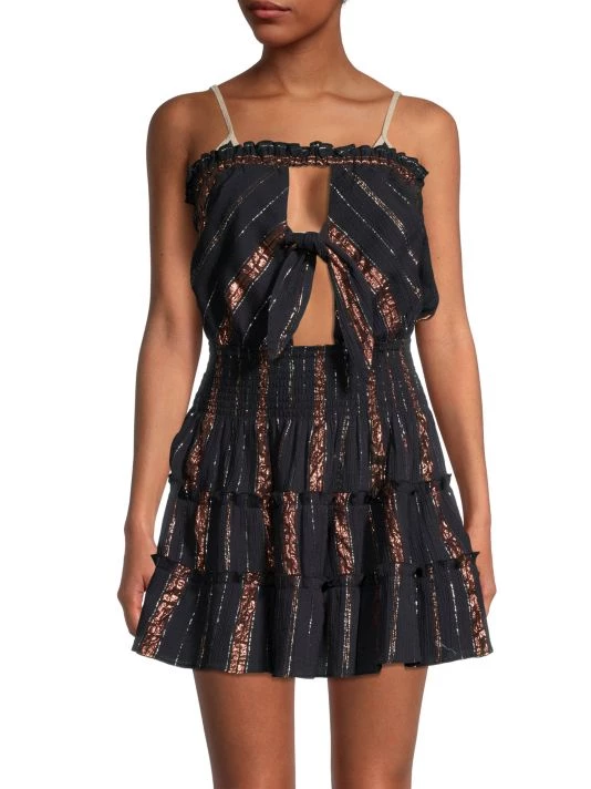 Highlighted with metallic threading, Ramy Brook’s Sabrina dress is designed with flattering cutouts complemented by a knotted detail. This piece is finished with a smocked waist and voluminous tiered skirt.