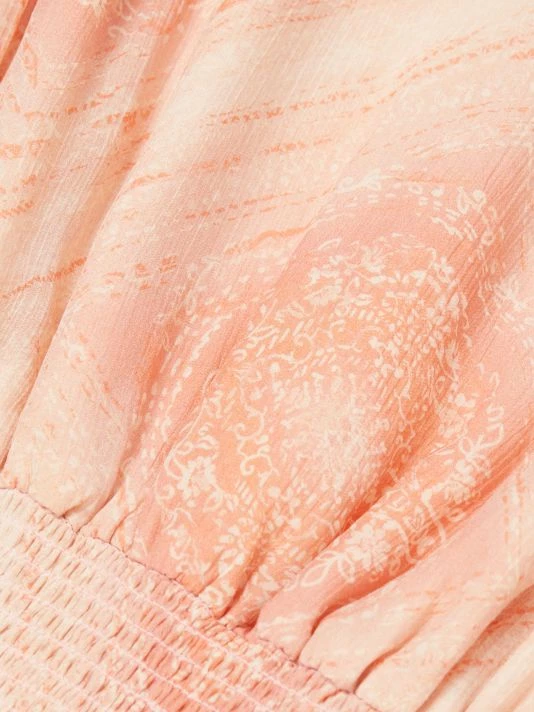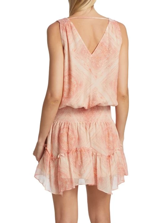 Ramy Brook’s Sandra minidress flows effortlessly from the sharp V-neck into a dropped smocked waist, adorned with an artful geometric print.