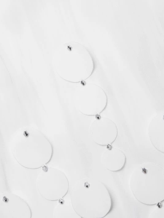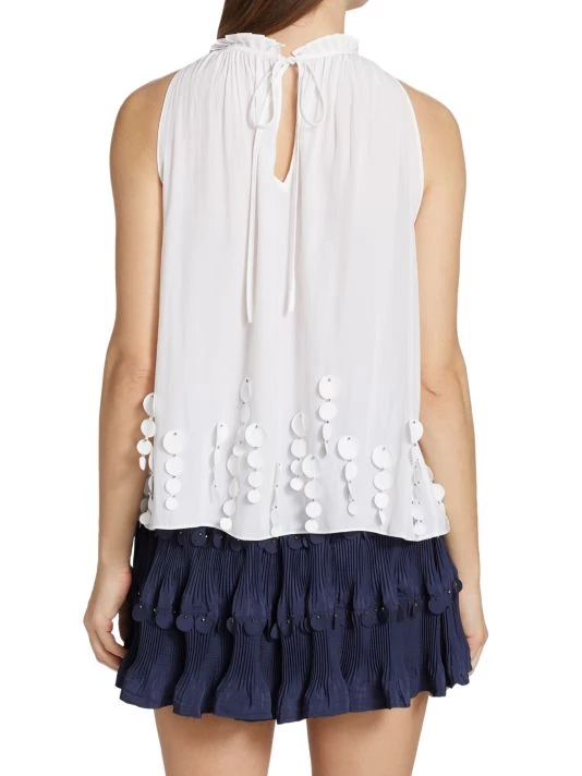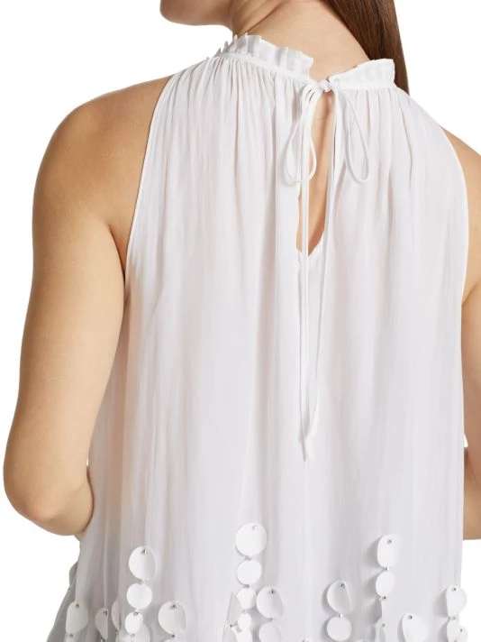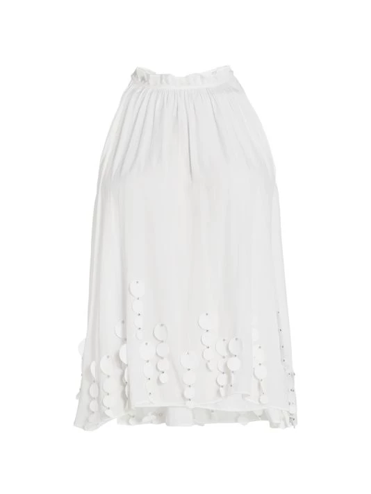This flowing, ruffle-neck halter top from Ramy Brooke is embellished with dot appliqués and silvertone beads.