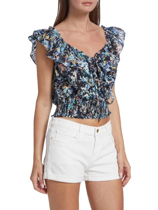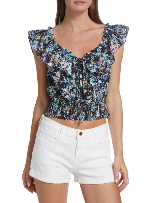 Ramy Brook’s Vance blouse is detailed with a floral bloom pattern and ruffle shoulders.