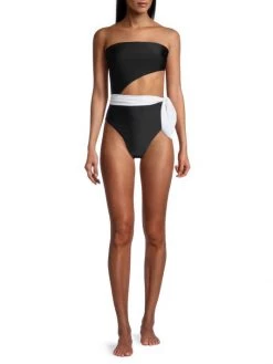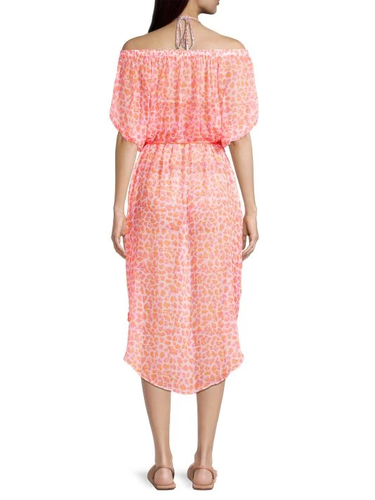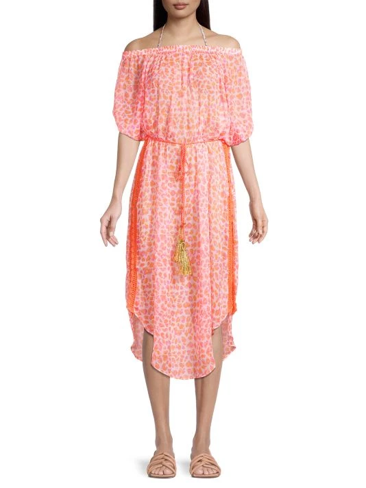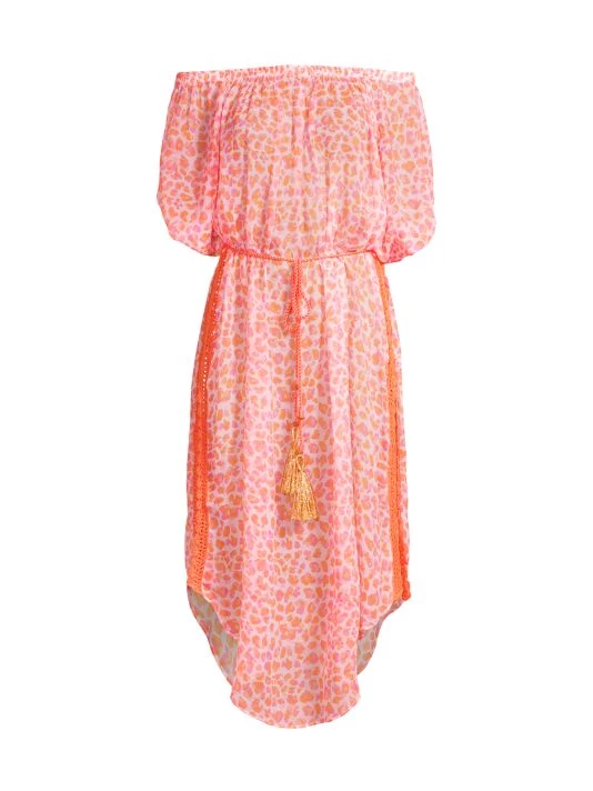 The Zuri dress by Ramy Brook is designed in an off-the-shoulder style with an asymmetric hem.